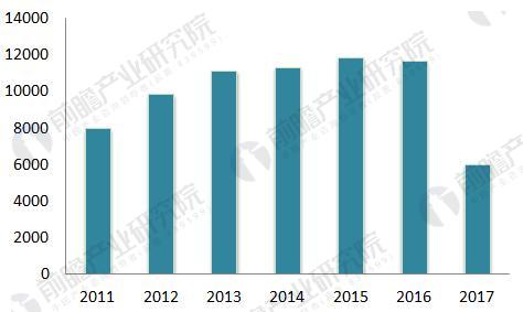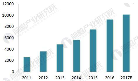 圖表2:2011-2017年中國(guó)傳感器市場(chǎng)規(guī)模情況(單位:億元)